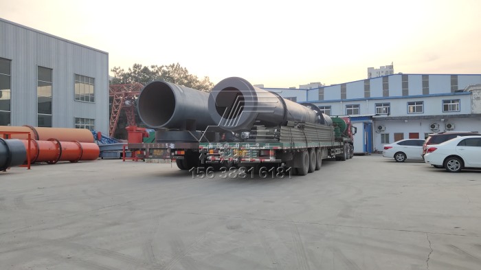 第一車與第二車裝載的是烘干、冷卻機(jī),滾筒烘干機(jī)的直徑為1.5米,長度15米,回轉(zhuǎn)式冷卻機(jī)的型號小一號,直徑為1.4米,長度為14米。