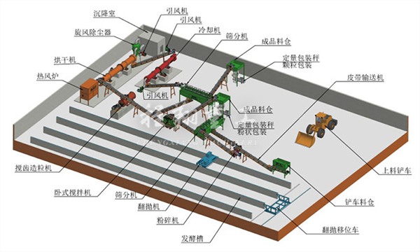 粒狀有機(jī)肥料生產(chǎn)線所需設(shè)備一般有:1)鏟車、2)翻堆機(jī)、3)定量給料震動(dòng)料倉(cāng)、4)粉碎機(jī)、5)滾筒篩分機(jī)、6)皮帶輸送機(jī)、7)電子動(dòng)態(tài)配料稱(可選)、8)混合攪拌機(jī)、9)造粒機(jī)、10)滾筒烘干機(jī)、11)滾筒式冷卻機(jī)、12)噴漿包膜機(jī)(可選)、13)自動(dòng)定量包裝機(jī)